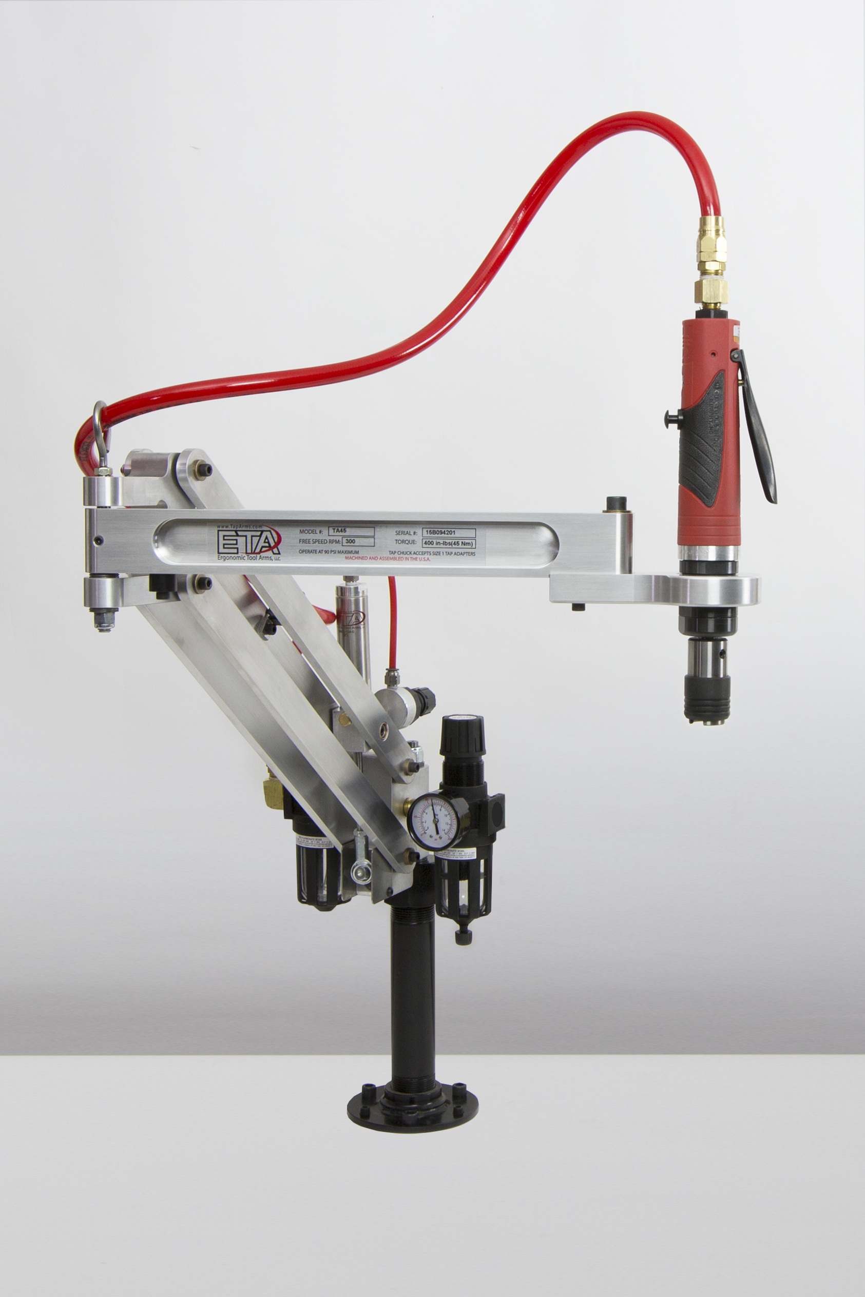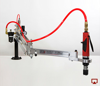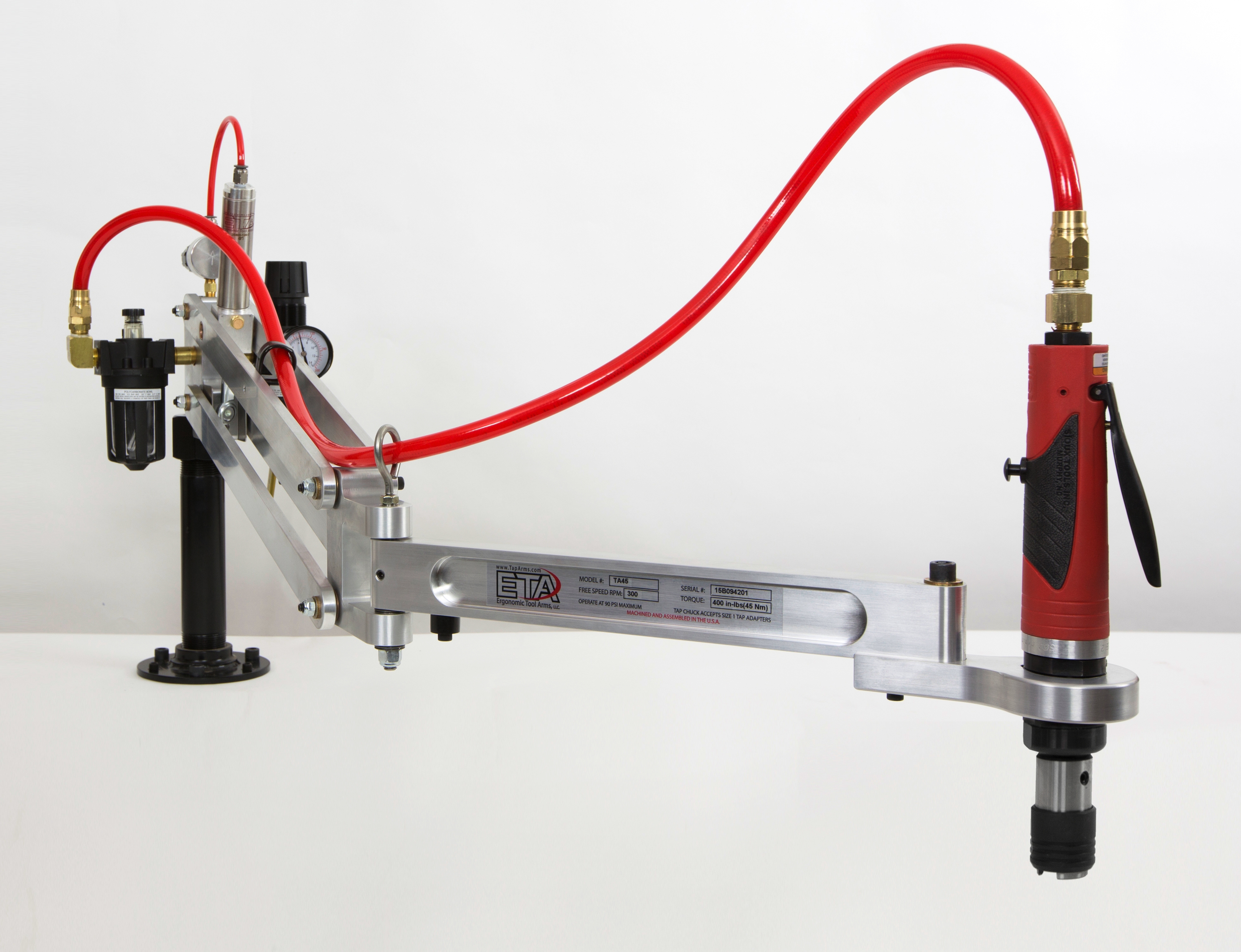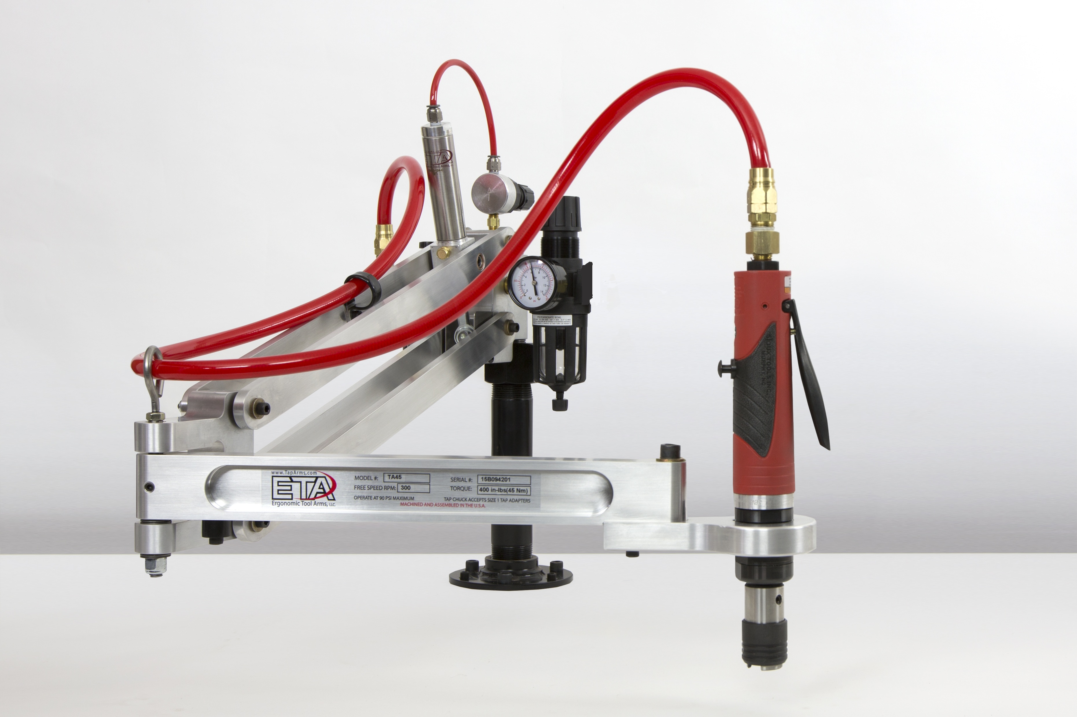 | * Maximum tap sizes are conservatively based on actual shop tests, but are dependent on a number of factors including air supply volume, hole size, hole depth, tap configuration, tap dullness, thread cutting lubrication and tap motor lubrication. If your application requires thread sizes at or near the limits above, as a free service ETA will test your sample parts with your tap using a TA Series Tapping Arm. Consult your ETA distributor or contact us at ETA directly to make arrangements. ETA Tap Arm Systems are available through Authorized ETA Distributors only. Please contact us for the name of your closest distributor. |