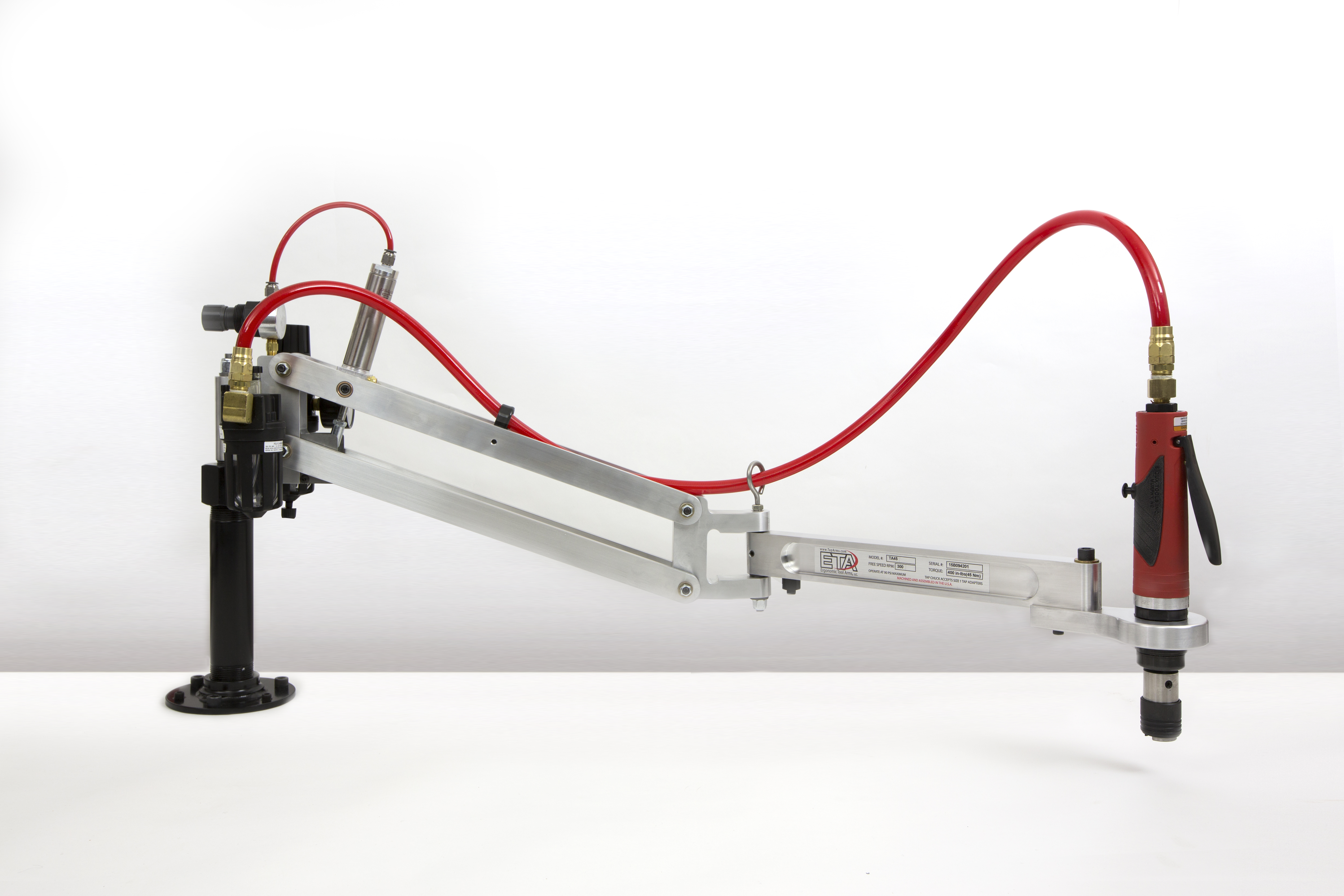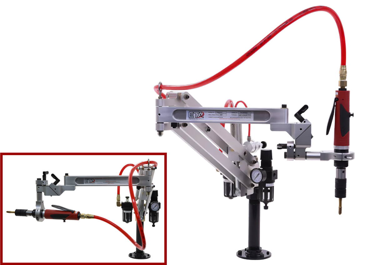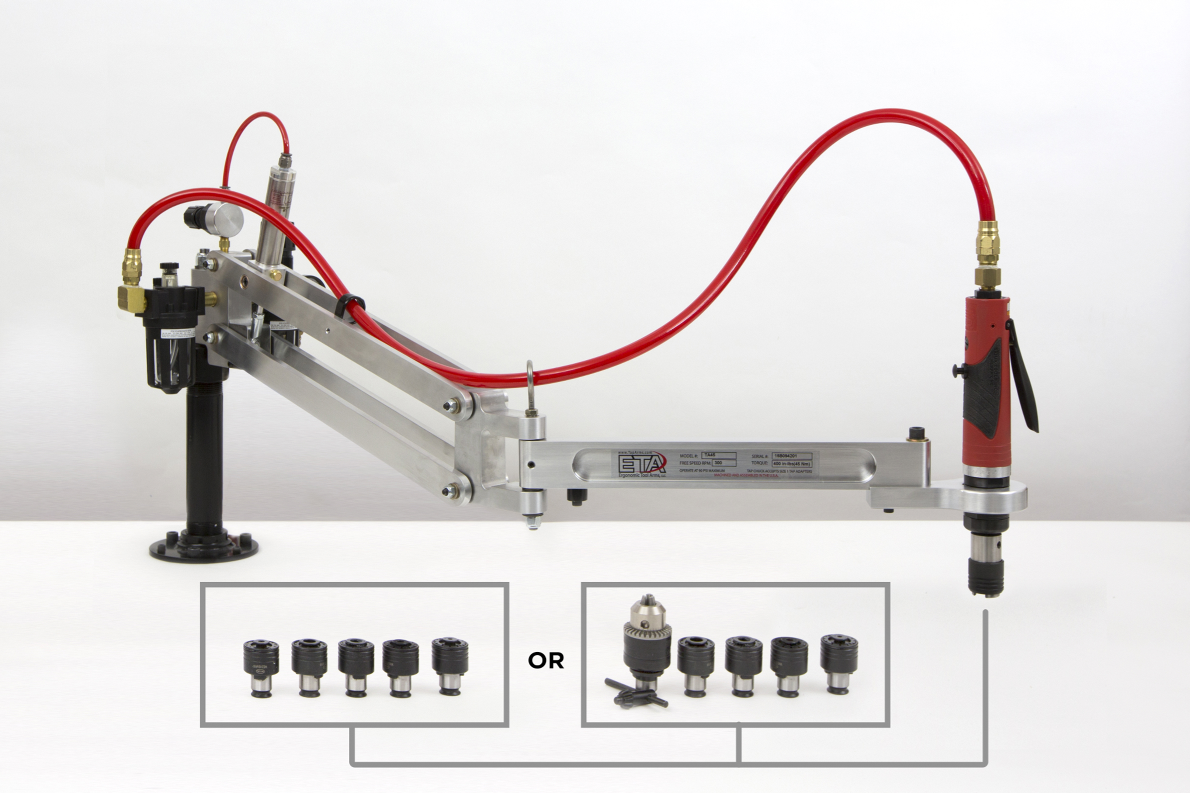 | * Maximum tap sizes are conservatively based on actual shop tests, but are dependent on a number of factors including air supply volume, hole size, hole depth, tap configuration, tap dullness, thread cutting lubrication and tap motor lubrication. If your application requires thread sizes at or near the limits above, as a free service ETA will test your sample parts with your tap using a TA Series Tapping Arm. Consult your ETA distributor or contact us at ETA directly to make arrangements. ETA Tap Arm Systems are available through Authorized ETA Distributors only. Please contact us for the name of your closest distributor. |